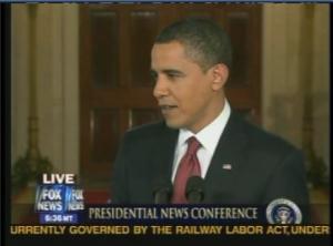 FOX's Brett Baier's first impression of President Obama's National Press Conference after telling us how long it was and how many questions he took was to cut to a shot of the massive screen in the back and middle of the room and he said that Obama read his opening statement there. Wow. Did the media focus on President Bush's use of the teleprompter, ever?
