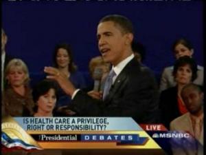Obama: Well, I think it should be a right for every American. In a country as wealthy as ours, for us to have people who are going bankrupt because they can't pay their medical bills -- for my mother to die of cancer at the age of 53 and have to spend the last months of her life in the hospital room arguing with insurance companies because they're saying that this may be a pre-existing condition and they don't have to pay her treatment, there's something fundamentally wrong about that.