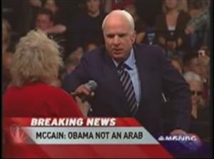 So it's come to this. At a town hall meeting in Minnesota Friday night, John McCain was loudly booed after he defended Obama as a "decent man" that his supporters shouldn't be afraid of. The answer came in response to two questions from audience members, one by a man who said he's afraid of raising his unborn first child in Barack Obama's America, and another one from an older woman, who McCain had to yank the mic away from, after she called him "an Arab" that she "couldn't trust."