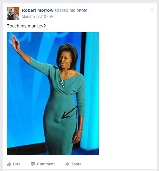 By the way, that doctored photo of Michelle Obama in a teal dress also shows up on the Facebook page of Robert Morrow, the half-insane Obama- and Clinton-hater (and current chair of the Republican Party in Travis County, Texas) who co-authored a book with Trump pal Roger Stone called The Clintons' War on Women. Here's the post, one of many repulsive Morrow posts collected by Media Matters: