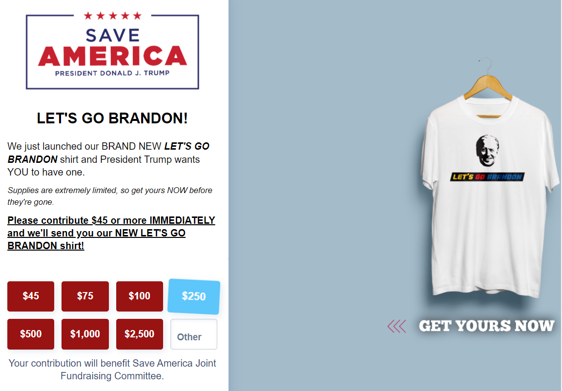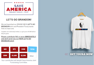 Meanwhile, merchandise with the slogan "Let's Go Brandon" -- a euphemism for "F*ck You, Biden" -- is being sold by the once and possibly future president of the United States.